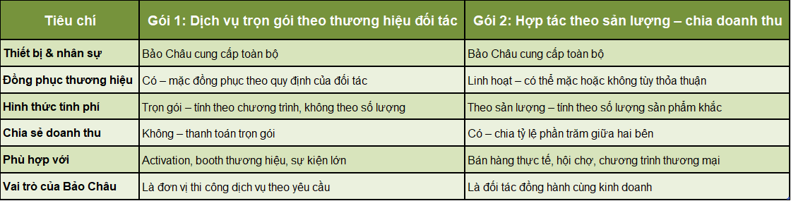 Bảng so sánh dịch vụ Xem chi tiếtBảo Châu và đối tác cùng đồng hành, cùng hưởng lợi theo hiệu quả thực tế của chương trình.